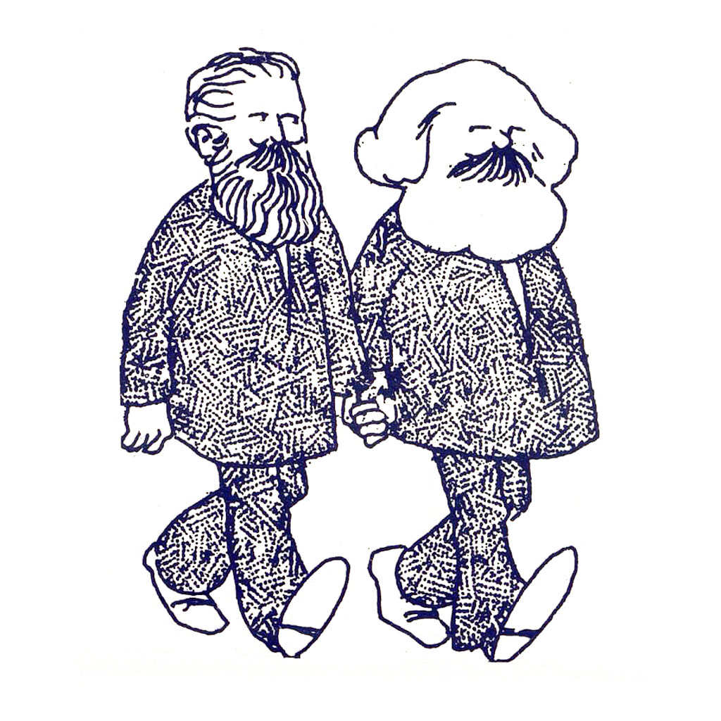 Karl Marx and Friedrich Engels segurando as mãos. Ilustração de uma publicação sobre homossexualidade e comunismo publicada no "Gay Liberator" em dezembro de 1974. Detroit, EUA.