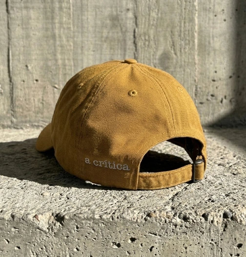 Boné Dad Hat em sarja de algodão, modelo desestruturado de 6 painéis com perfil baixo e aba curva. Confeccionado em tecido resistente com acabamento levemente vintage. Possui patch frontal bordado aplicado, ilhós para ventilação e fecho traseiro ajustável.