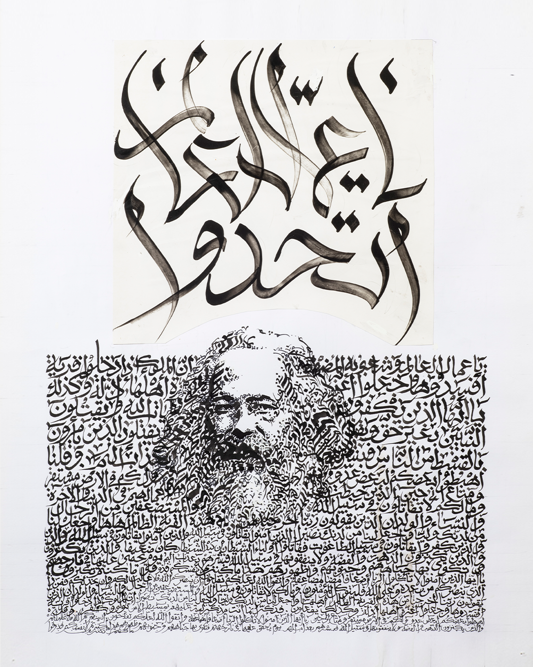 A escrita na parte superior é “Proletários de todo o mundo, uni-vos!” . Os traços faciais de Karl Marx são formados por uma escrita falsa (as letras árabes são reconhecíveis, mas não há texto). O fundo é composto por uma seleção de versículos do Alcorão que incitam os muçulmanos a lutar contra a tirania e a injustiça.