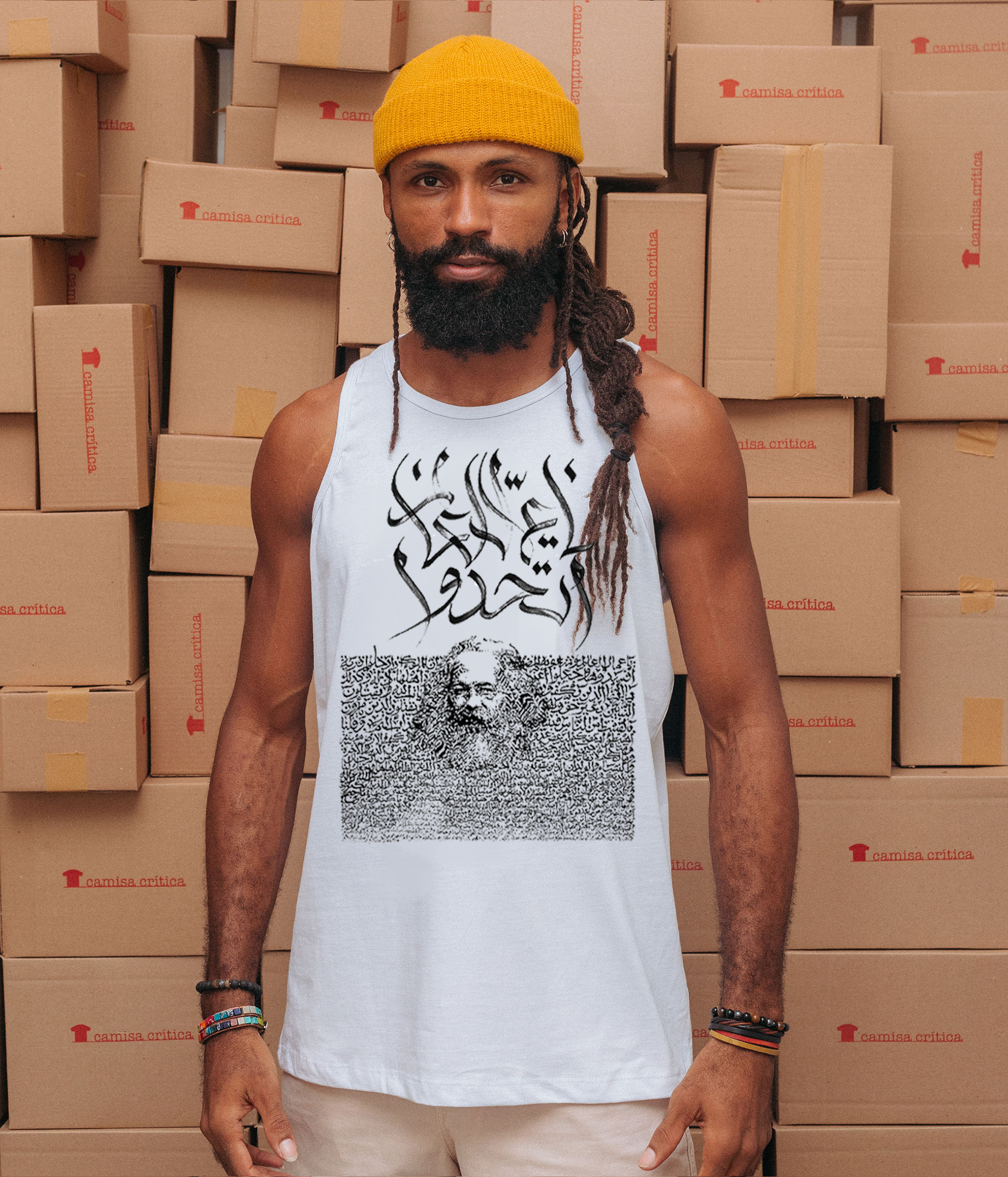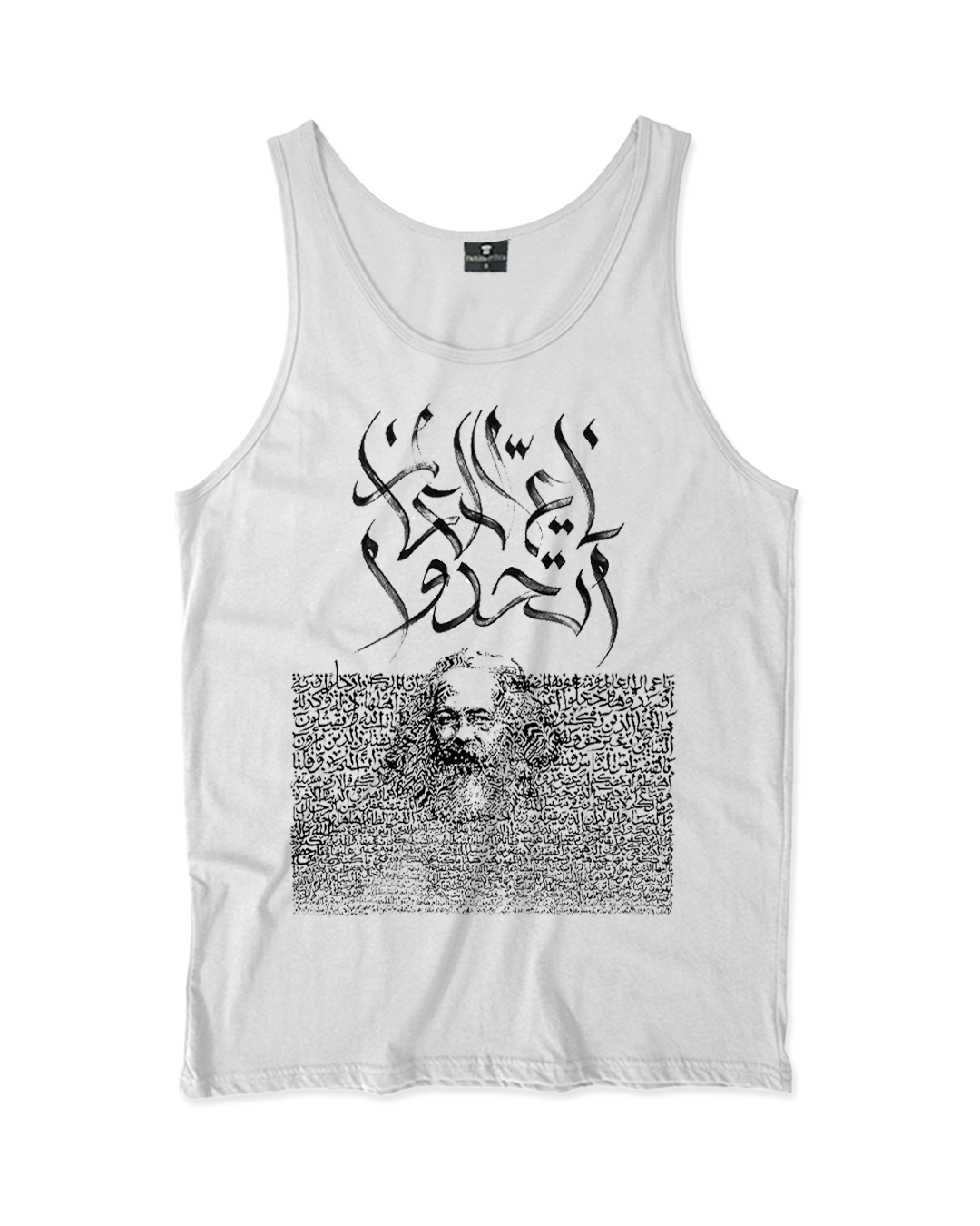 A escrita na parte superior é “Proletários de todo o mundo, uni-vos!” . Os traços faciais de Karl Marx são formados por uma escrita falsa (as letras árabes são reconhecíveis, mas não há texto). O fundo é composto por uma seleção de versículos do Alcorão que incitam os muçulmanos a lutar contra a tirania e a injustiça.