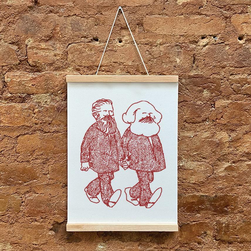 Karl Marx and Friedrich Engels segurando as mãos. Ilustração de uma publicação sobre homossexualidade e comunismo publicada no "Gay Liberator" em dezembro de 1974. Detroit, EUA.⁣